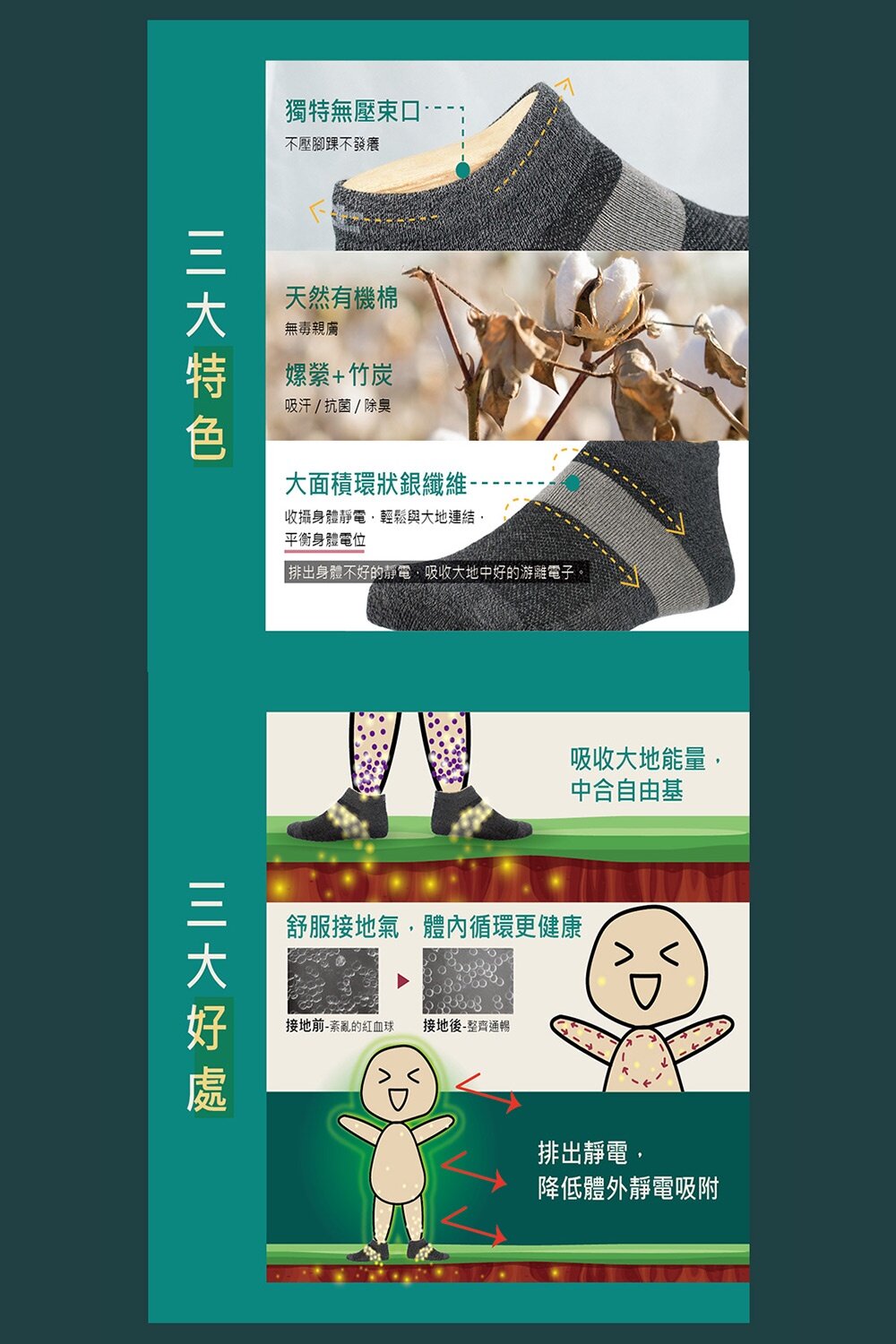 銀纖維排靜電機能襪 天然有機棉-吸濕-抗菌-竹炭